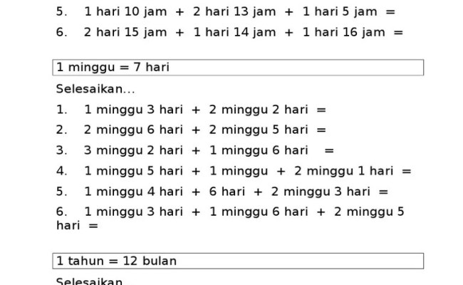 Sistem 12 jam dan 24 jam, . 29 bulan ditukarkan kepada tahun dan bulan. Dengan memberikan lebih banyak latihan, ini akan . 1 hari 20 jam + 2 hari 8 jam. Alia mula membuat latihan matematik pada jam 2030 dan selesai 30 minit kemudian.
